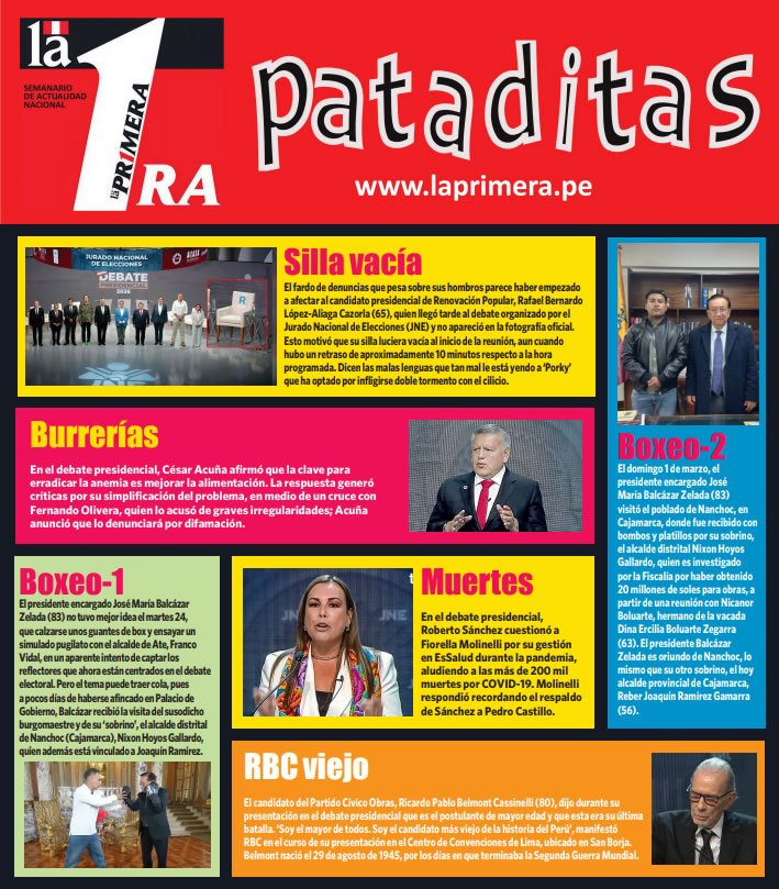 Fútbol Alianza Lima arrasa: aplasta 8-0 a Cusco FC y toma la cima 18 de abril de 2026 Fútbol Choque tenso en Huancayo: urgencias y puntos en juego 18 de abril de 2026 Fútbol Con Cueva en foco: Juan Pablo II busca frenar a Comerciantes 18 de abril de 2026 Fútbol Cajamarca vs ADT: dos equipos en crisis buscan aire en la fecha 11 18 de abril de 2026 Fútbol Los Chankas no sueltan la cima: golpean a Grau y siguen intratables (VIDEO) 18 de abril de 2026 Pataditas ONPE habilita plataforma oficial con resultados en tiempo real de Elecciones 2026 17 de abril de 2026 Fútbol Alianza Lima arrasa: aplasta 8-0 a Cusco FC y toma la cima 18 de abril de 2026 Fútbol Choque tenso en Huancayo: urgencias y puntos en juego 18 de abril de 2026 Fútbol Con Cueva en foco: Juan Pablo II busca frenar a Comerciantes 18 de abril de 2026 Fútbol Cajamarca vs ADT: dos equipos en crisis buscan aire en la fecha 11 18 de abril de 2026 Fútbol Los Chankas no sueltan la cima: golpean a Grau y siguen intratables (VIDEO) 18 de abril de 2026 Pataditas ONPE habilita plataforma oficial con resultados en tiempo real de Elecciones 2026 17 de abril de 2026 Política Fujimori se desmarca de López Aliaga y rechaza llamados a la insurgenciaDenuncian a López Aliaga por presunta incitación a la insurgencia electoralMisión de la OEA respalda elecciones en Perú pese a fallas logísticas“El voto se va a respetar”: Sánchez y López Aliaga tensan el escenario electoral Fútbol Alianza Lima arrasa: aplasta 8-0 a Cusco FC y toma la cimaChoque tenso en Huancayo: urgencias y puntos en juegoCon Cueva en foco: Juan Pablo II busca frenar a ComerciantesCajamarca vs ADT: dos equipos en crisis buscan aire en la fecha 11 Mundo El Papa arremete contra “tiranos” y desata choque frontal con TrumpBombardeos en Líbano dejan más de 100 muertos y agravan conflictoIrán golpea en el aire: derribo de aviones sacude a EE.UU.Trabajar ya no alcanza: crece la pobreza entre empleados en Argentina Entradas Fútbol Alianza Lima arrasa: aplasta 8-0 a Cusco FC y toma la cima Fútbol Choque tenso en Huancayo: urgencias y puntos en juego Fútbol Con Cueva en foco: Juan Pablo II busca frenar a Comerciantes Fútbol Cajamarca vs ADT: dos equipos en crisis buscan aire en la fecha 11 Fútbol Los Chankas no sueltan la cima: golpean a Grau y siguen intratables (VIDEO) Descargar versión digital Salud Sedentarismo se dispara en Perú: 1 de cada 4 no hace ejercicioMaternidad en riesgo: Perú reduce mortalidad materna, pero persisten brechas en atención primariaVerano intenso: especialistas recomiendan frutas y verduras para prevenir golpes de calor (VIDEO)Saunas y baños fríos: beneficios reales y límites según la evidencia científica Cultura Artemis II capta eclipse solar y “puesta de Tierra” en sobrevuelo lunarLos países más seguros para mujeres que viajan solas: tendencias y destinos claveEl Ave María: la oración sencilla que dominó siglos de feTumbes en enero: clima, biodiversidad y gastronomía impulsan su atractivo turístico (VIDEO) Editorial EL PERÚ LES INTERESA UN COMINODESMONTANDO LA MÁQUINA Economía Mercado del aceite de oliva en Perú crece pese al fuerte aumento de preciosPromesa de matrimonio incumplida no debe derivar en conflictos judicialesInnovar o quedarse atrás: el nuevo desafío del sector inmobiliario peruanoMinería y agro empujan al Perú: Exportaciones del Perú rompen récord y superan los US$ 90 mil millones en 2025 Pataditas ONPE habilita plataforma oficial con resultados en tiempo real de Elecciones 2026López Aliaga retrocede y borra oferta de S/20 mil en plena tensión electoral¿Cuándo será la segunda vuelta presidencial en Perú?Chino mudo-2 Informes Especiales 'PANAMA PAPERS' CERCAN A LOPEZ ALIAGAACUÑA EN LA MIRA DE TRUMPLópez Aliaga agita el fantasma del fraude sin pruebasUNICEF advierte: más de 100 niños habrían fallecido en Gaza desde el alto el fuego Videos Alianza Lima arrasa: aplasta 8-0 a Cusco FC y toma la cimaLos Chankas no sueltan la cima: golpean a Grau y siguen intratables (VIDEO)Melgar despierta con goleada, corta su mala racha y hunde a Sport Boys (VIDEO)Alianza golpea en la altura y vuelve a la cima del torneo (VIDEO) Fotos Choque tenso en Huancayo: urgencias y puntos en juegoCon Cueva en foco: Juan Pablo II busca frenar a ComerciantesONPE habilita plataforma oficial con resultados en tiempo real de Elecciones 2026Sedentarismo se dispara en Perú: 1 de cada 4 no hace ejercicio