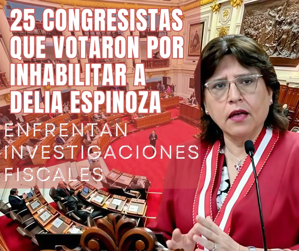 Un total de 25 congresistas que votaron a favor de la inhabilitación por 10 años de la fiscal suprema Delia Espinoza registran investigaciones en curso en el Ministerio Público por presuntos delitos de cohecho, peculado, enriquecimiento ilícito, abuso de autoridad y presuntas coordinaciones con la exfiscal de la Nación Patricia Benavides. La decisión del pleno, aprobada con 71 votos a favor, 19 en contra y 3 abstenciones, contó con el respaldo de legisladores de diez bancadas, así como de parlamentarios no agrupados.
