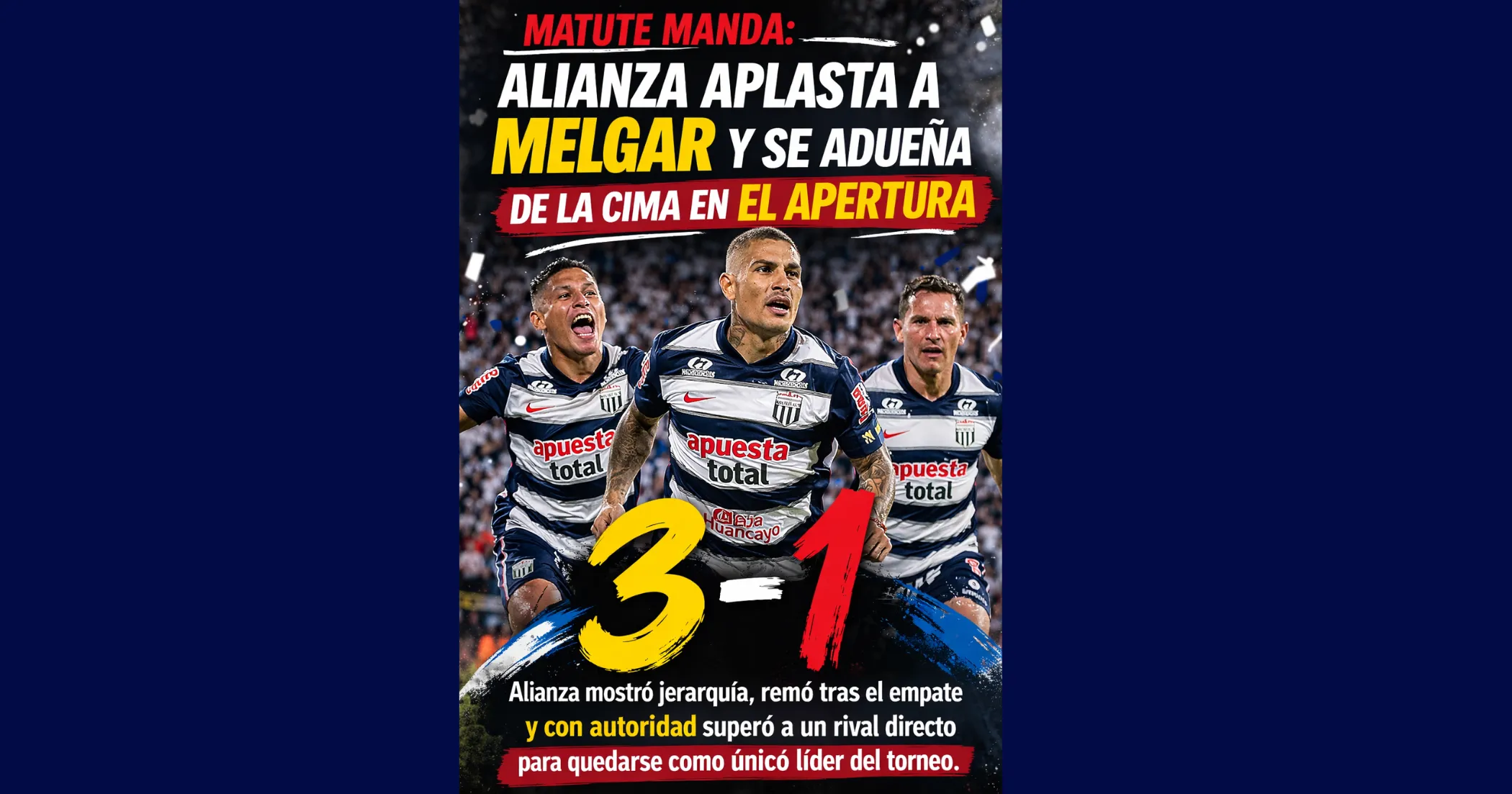 Alianza Lima derrotó 3-1 a Melgar en Matute, recuperó el liderato del Torneo Apertura 2026 y dejó una actuación con señales de solidez colectiva, capacidad de reacción y peso ofensivo. Melgar, que había encontrado el empate antes del descanso, no logró sostener la igualdad en el segundo tiempo y quedó relegado en la lucha inmediata por la punta.