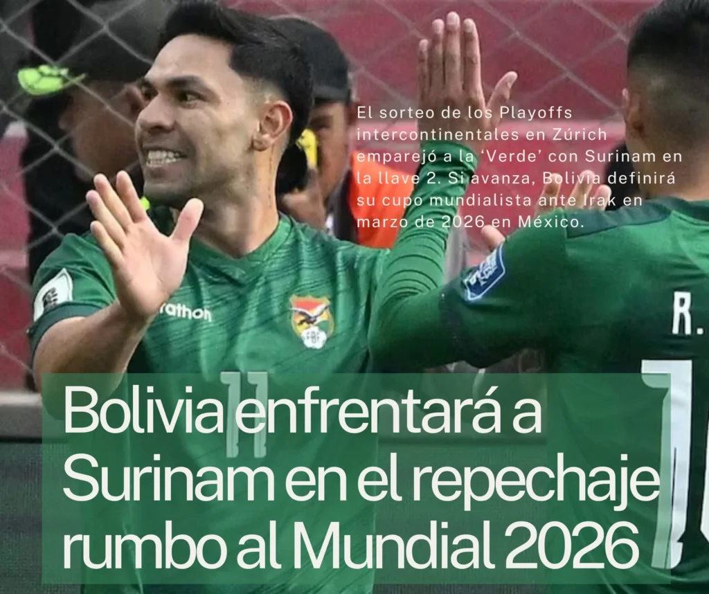El sorteo de los Playoffs intercontinentales en Zúrich emparejó a la ‘Verde’ con Surinam en la llave 2. Si avanza, Bolivia definirá su cupo mundialista ante Irak en marzo de 2026 en México.