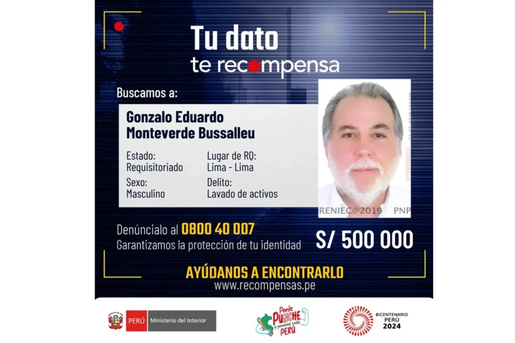 De 100 mil a medio millón de soles se incrementó la recompensa por información relevante que permita la ubicación o captura del empresario Gonzalo Monteverde Bussalleu, sindicado como el operador financiero de pagos ilícitos de la compañía Odebrecht en el Perú.