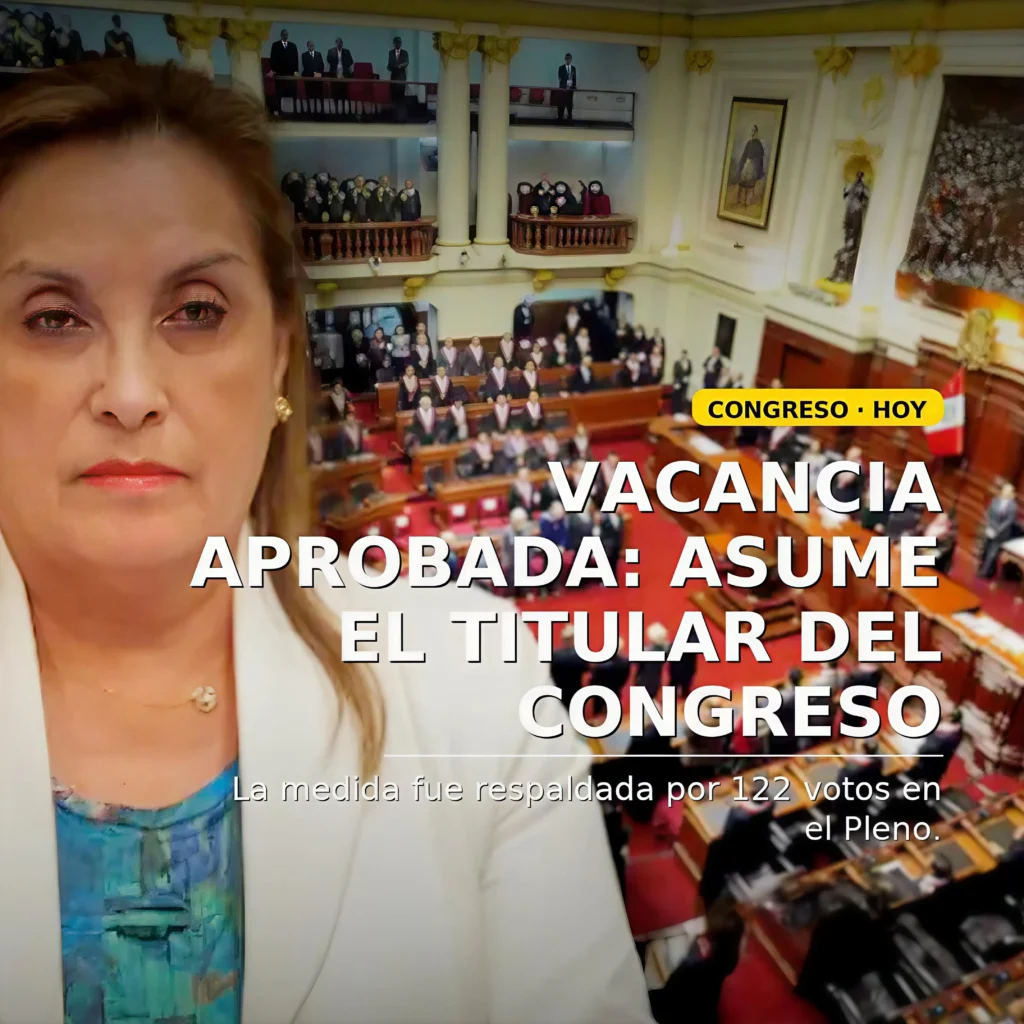 El Pleno del Congreso declaró la vacancia de la presidenta Dina Boluarte por permanente incapacidad moral con 122 votos a favor, en una sesión plenaria en Lima, tras el debate iniciado el mismo día en que se presentaron cuatro mociones. La mandataria no asistió a ejercer su defensa; su abogado sostuvo que se vulneraron el debido proceso y el plazo razonable.