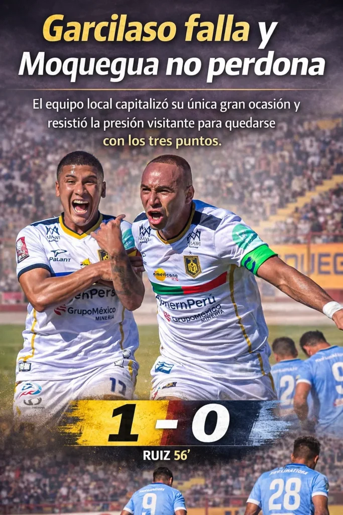La victoria 1-0 de Deportivo Moquegua ante Deportivo Garcilaso, definida por el gol de Kevin Ruiz en el segundo tiempo, dejó como saldo tres puntos para el conjunto local y mantiene la competencia ajustada en la cuarta fecha del Torneo Apertura 2026.