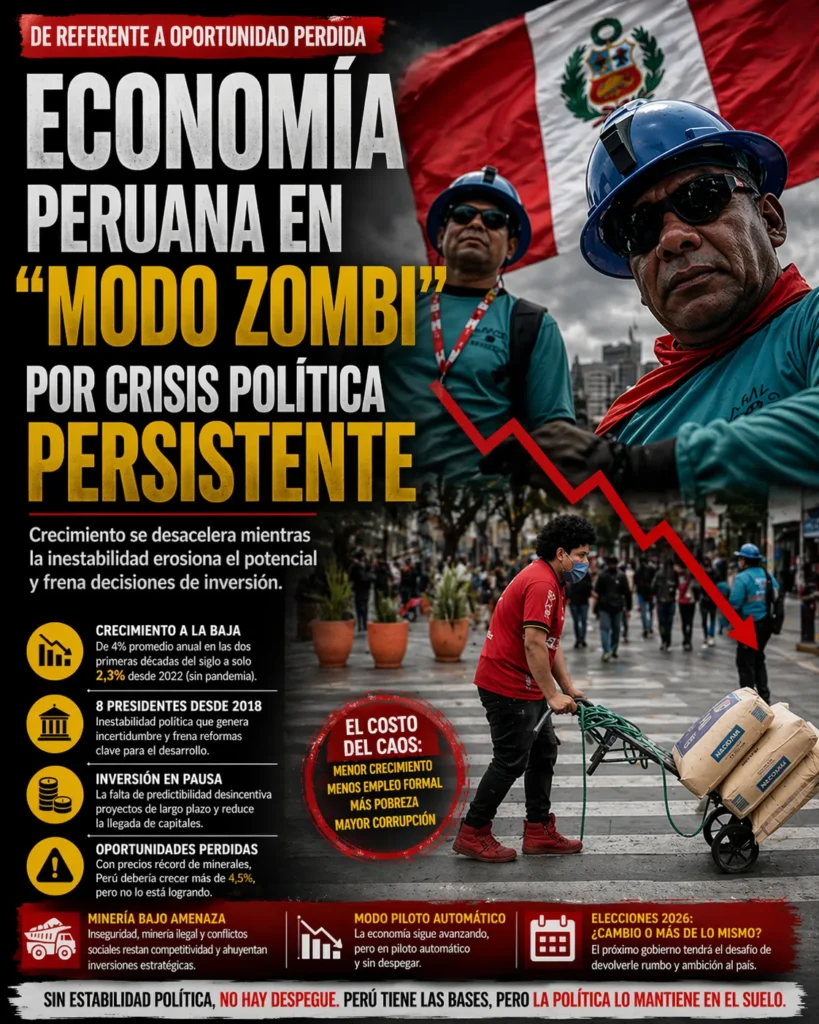 Especialistas como el economista Armando Mendoza señalan que la idea de que la economía peruana es inmune a la política resulta incompleta. Según explica, el país opera actualmente en un “modo zombi”, con crecimiento sostenido pero por debajo de su potencial, debido a la falta de dirección política clara.