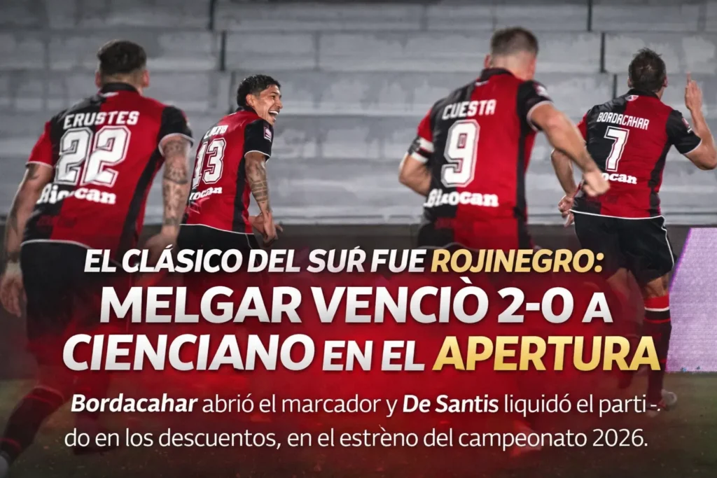 Melgar debutó con victoria en el Torneo Apertura 2026 de la Liga 1 Perú al imponerse por 2-0 a Cienciano este viernes 31 de enero en el estadio Monumental de la UNSA, en una nueva edición del Clásico del Sur. Cristian Bordacahar abrió el marcador en el primer tiempo y Jeriel De Santis sentenció el resultado en los descuentos de la segunda mitad, en un partido dirigido por el árbitro Edwin Ordóñez Medina.