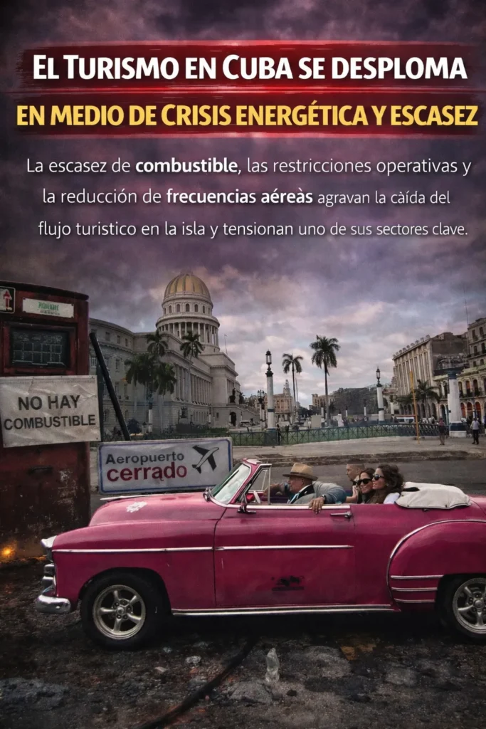 Cuba atraviesa en 2026 una nueva fase de contracción turística marcada por la escasez de combustible, la cancelación de rutas aéreas y el descenso continuado de visitantes internacionales, en un contexto de crisis energética y falta de divisas que limita la capacidad de maniobra del gobierno de Miguel Díaz-Canel y agrava la situación económica de la isla.