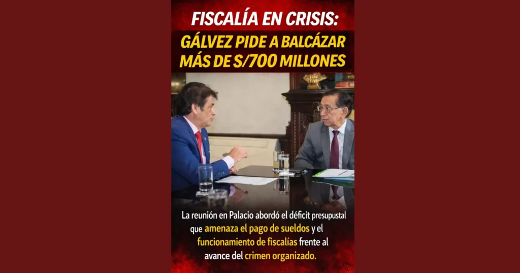 La reunión se produce en medio de una crisis financiera que afecta al Ministerio Público y que, según autoridades fiscales, compromete el funcionamiento de diversas sedes a nivel nacional. De acuerdo con información difundida por medios locales, Gálvez acudió al despacho presidencial acompañado por la secretaria general de la Fiscalía de la Nación, Ana Velarde Roa, y por el gerente general del Ministerio Público, César Enrique Gutiérrez.
