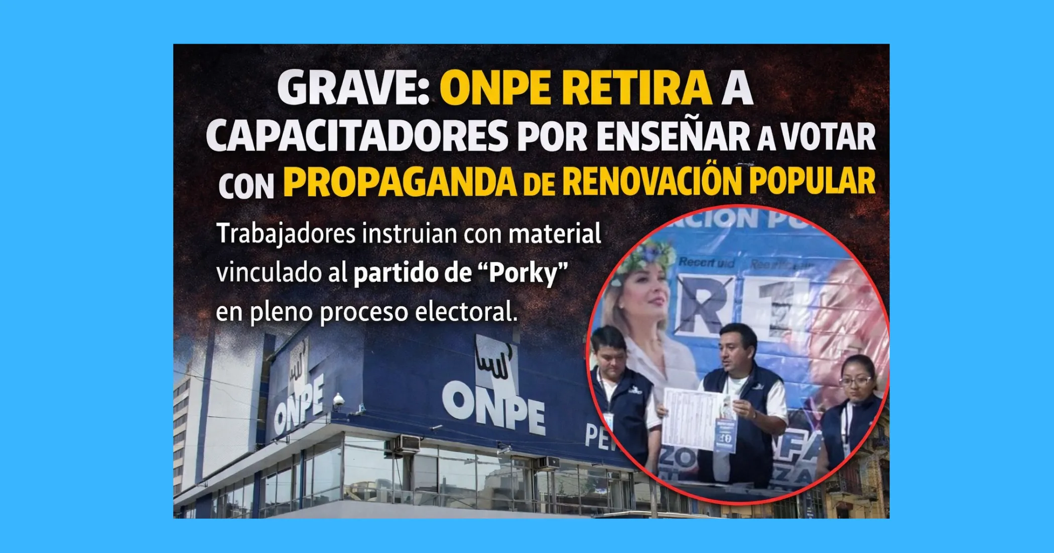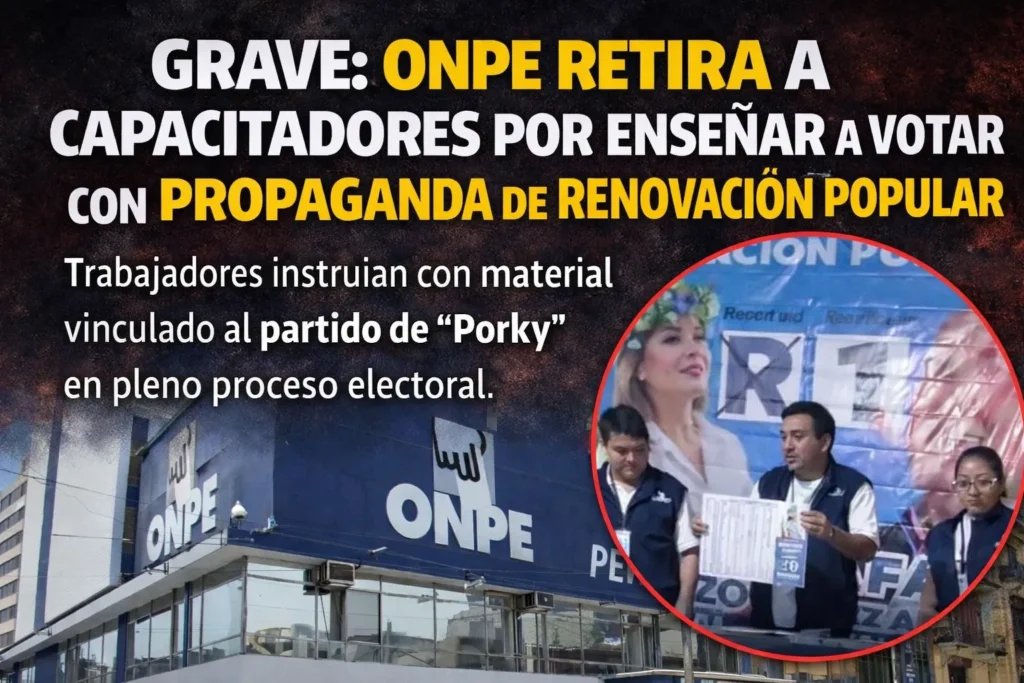 La Oficina Nacional de Procesos Electorales (ONPE) retiró a un grupo de capacitadores tras ser grabados enseñando a votar con material que contenía propaganda del partido Renovación Popular, en un hecho ocurrido en el distrito de Huimbayoc, provincia de San Martín, en el contexto de las Elecciones Generales 2026.