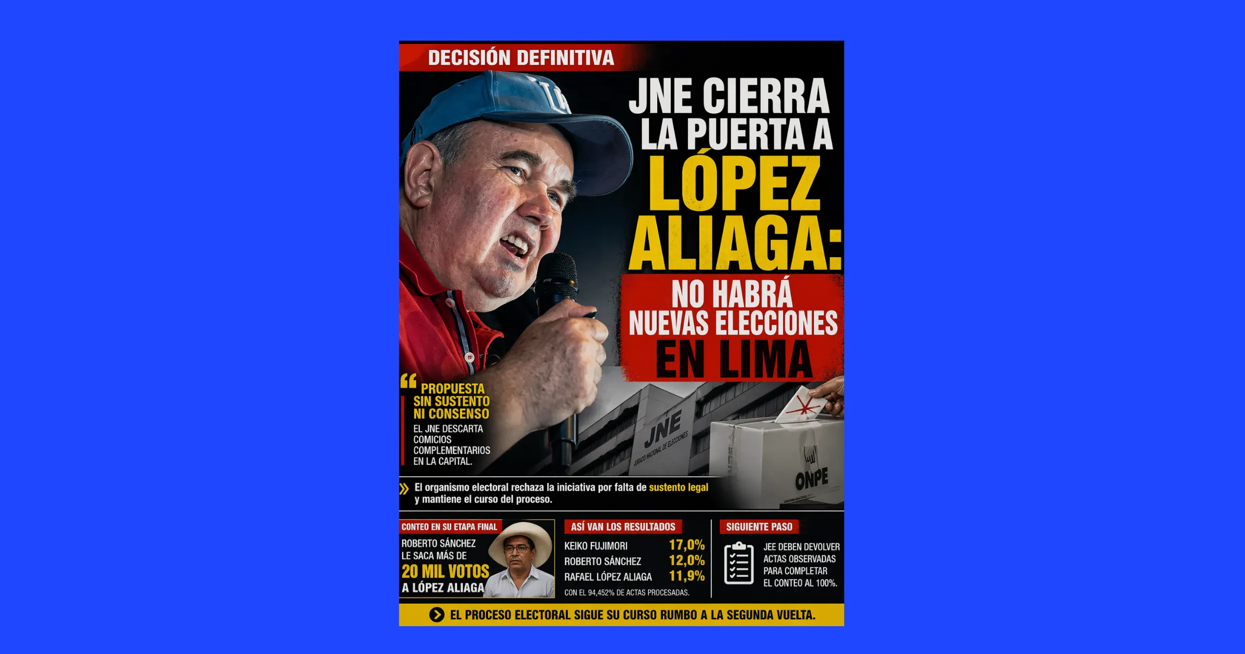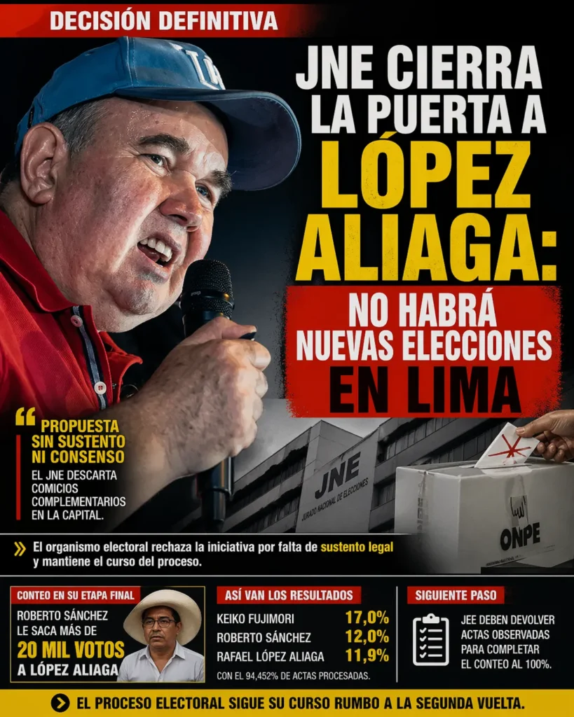 El Jurado Nacional de Elecciones (JNE) descartó este 22 de abril la realización de elecciones complementarias en Lima Metropolitana, propuesta impulsada por Rafael López Aliaga, tras concluir que no existe viabilidad legal ni consenso institucional para su convocatoria.