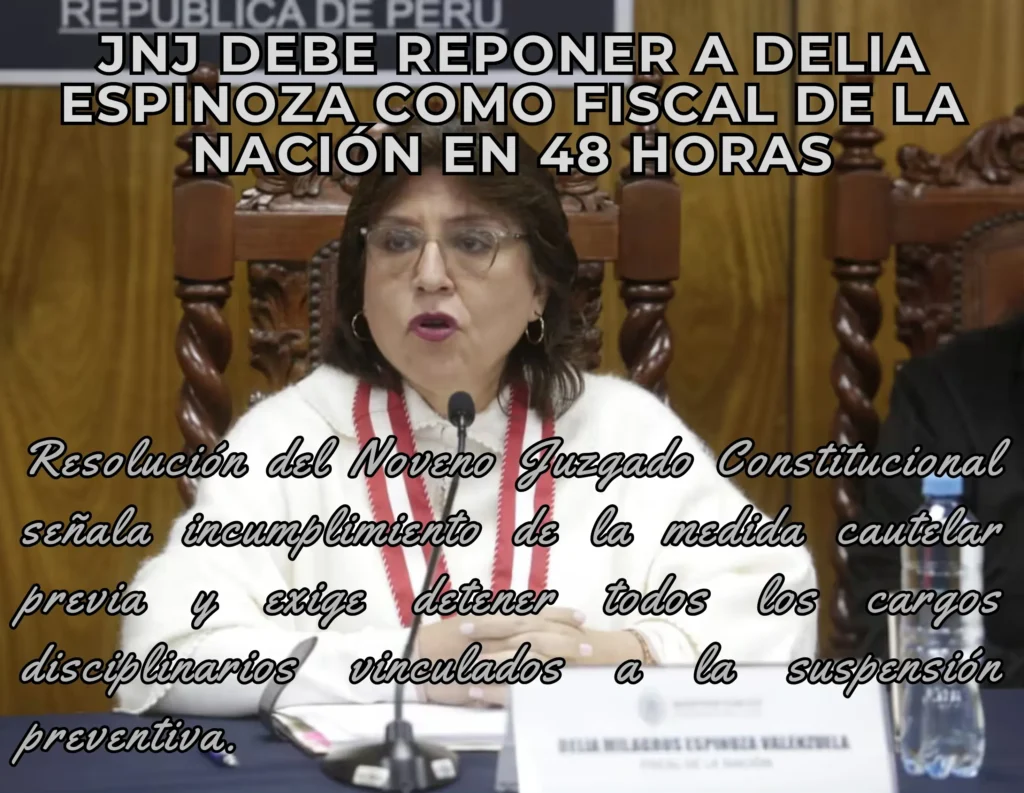 El Poder Judicial ordenó a la Junta Nacional de Justicia (JNJ) reponer en un plazo máximo de dos días a Delia Espinoza Valenzuela en el cargo de fiscal de la Nación, tras determinar que el órgano constitucional no cumplió correctamente con una medida cautelar previa que disponía su restitución.