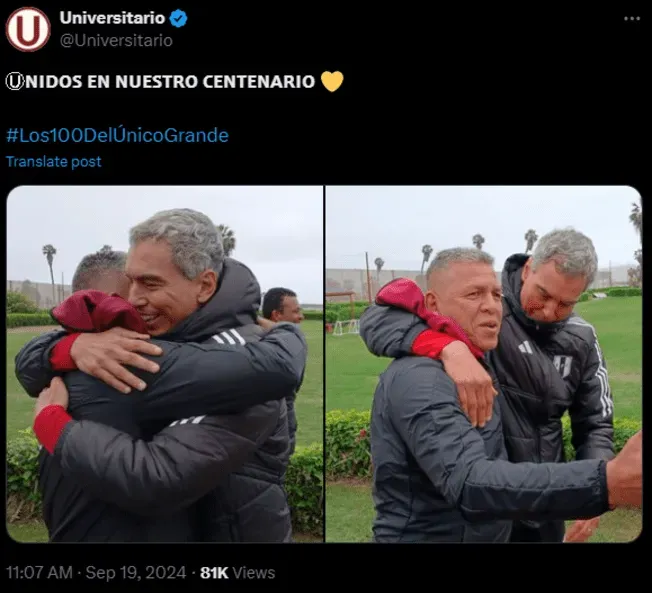 En sus redes sociales, los merengues resaltaron este emotivo reencuentro entre Carranza y Del Solar. “Unidos en nuestro Centenario”, publicó el club. No obstante, no fue el único en hacerlo. Jean Ferrari, administrador de los cremas, también expresó su sentir sobre este conmovedor encuentro en las instalaciones de entrenamiento del equipo. “Una de las cosas que más me alegra es ver a nuestra gente crema unida. ¡Grande ‘Puma’ y grande ‘Chemo’! ¡Vamos U!”, escribió.