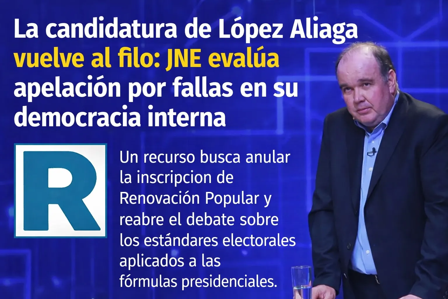 Un ciudadano interpuso un recurso de apelación ante el Jurado Nacional de Elecciones (JNE) para revertir la decisión del Jurado Electoral Especial (JEE) de Lima Centro 1 que declaró infundada la tacha contra la fórmula presidencial de Renovación Popular, encabezada por Rafael López Aliaga. El pedido solicita dejar sin efecto la inscripción de la lista presidencial al advertir presuntas vulneraciones a la democracia interna del partido, en el marco del proceso electoral de 2026.
