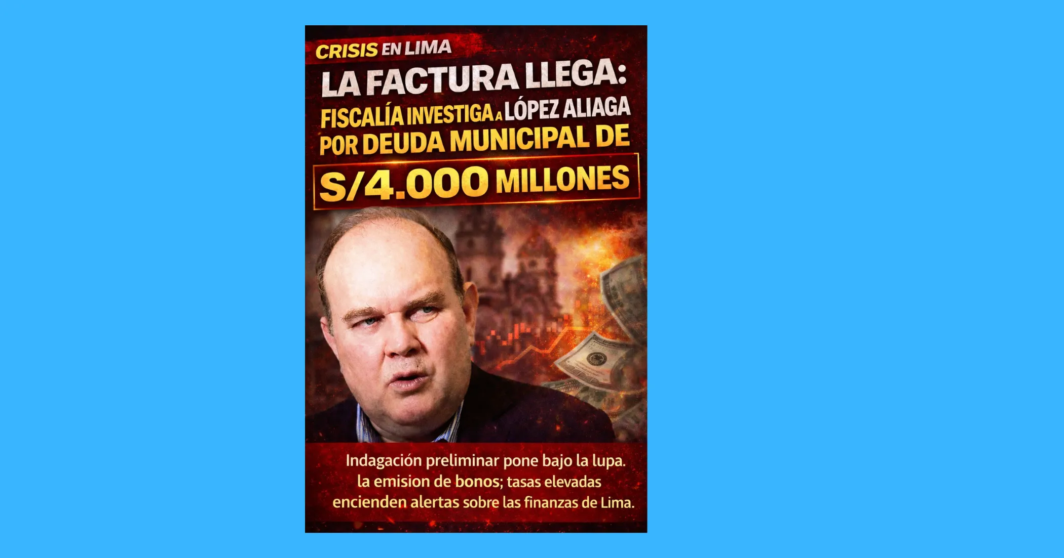 El Ministerio Público abrió una investigación preliminar contra Rafael López Aliaga por el endeudamiento de S/4.000 millones aprobado en la Municipalidad Metropolitana de Lima, tras detectarse posibles irregularidades en la emisión de bonos y en el proceso de contratación financiera.