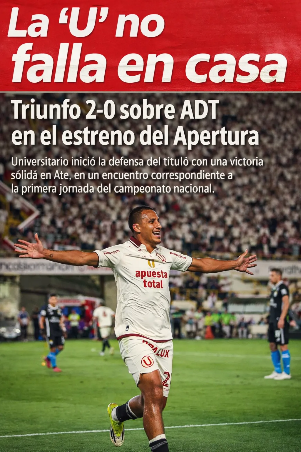 Universitario de Deportes inició su participación en el Torneo Apertura 2026 con una victoria por 2-0 frente a ADT de Tarma, este domingo en el Estadio Monumental de Ate, en un encuentro correspondiente a la primera fecha de la Liga 1.