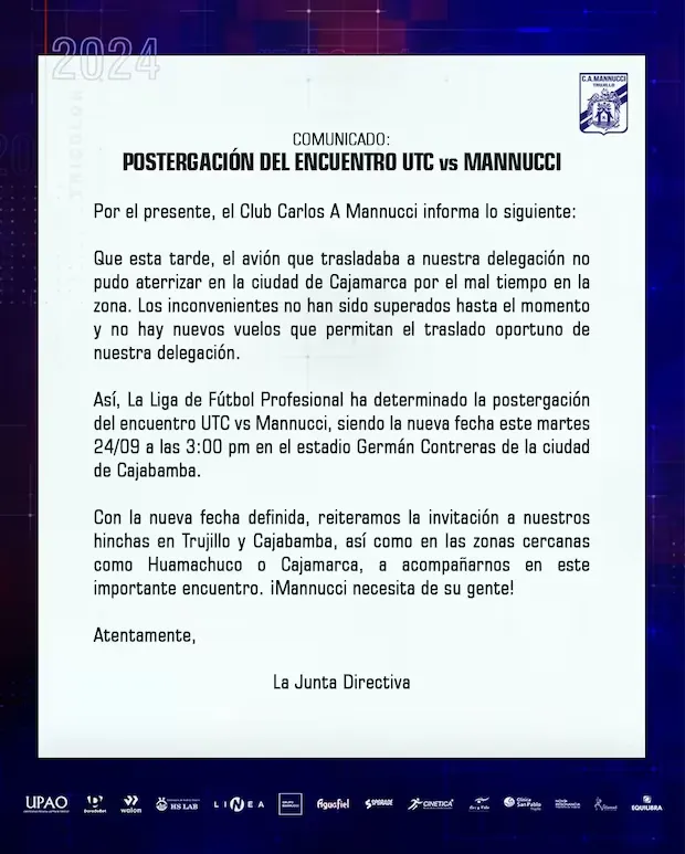 Inicialmente, el partido estaba programado para el lunes 23 de septiembre, pero Mannucci anunció la postergación de un día debido al mal clima que impidió el aterrizaje en Cajamarca. Por ello, la organización reprogramó el encuentro para el martes. “El avión que llevaba a nuestra delegación no pudo aterrizar en Cajamarca debido al mal tiempo. Los problemas persisten y no hay vuelos disponibles para el traslado a tiempo de nuestra delegación”, comunicó el equipo de Trujillo.