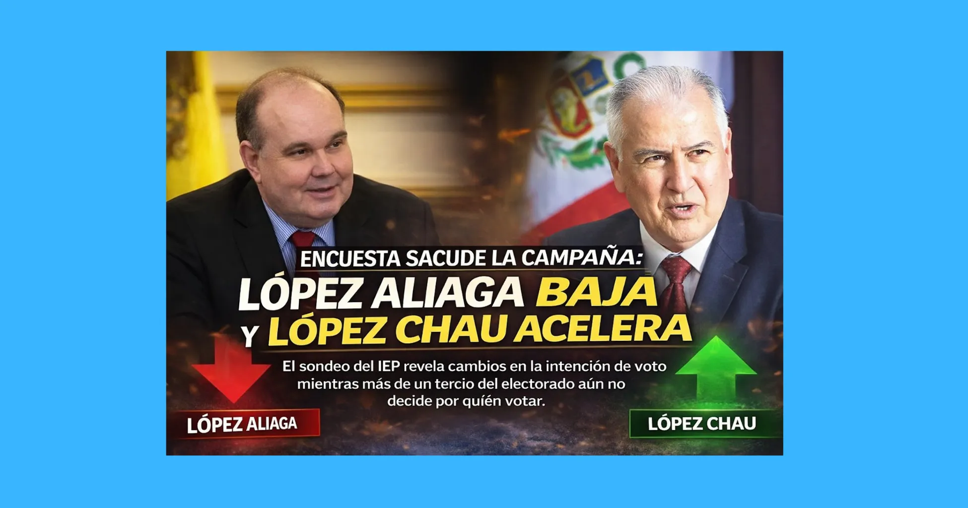 La última encuesta del Instituto de Estudios Peruanos muestra un panorama electoral en el que Rafael López Aliaga mantiene el liderazgo en intención de voto, aunque con una tendencia a la baja, mientras Alfonso López Chau registra un crecimiento progresivo en las preferencias. A pocas semanas de las elecciones presidenciales de 2026, el elevado porcentaje de votantes indecisos sugiere que la competencia electoral aún permanece abierta y su evolución dependerá de las campañas y el comportamiento del electorado en el tramo final previo a la votación.