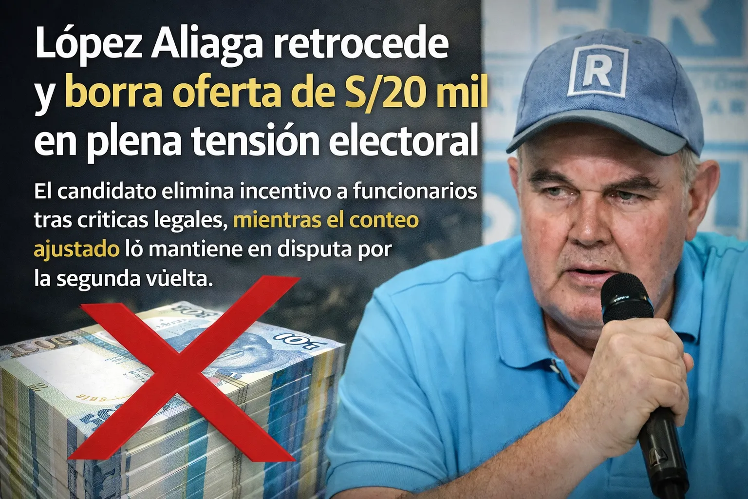 El candidato presidencial Rafael López Aliaga retiró la oferta de S/20 mil que había difundido en redes sociales para obtener pruebas de presuntas irregularidades electorales. La medida se produce en pleno conteo de votos de las Elecciones 2026, en el que compite estrechamente con Roberto Sánchez por el segundo lugar que dará acceso a la segunda vuelta frente a Keiko Fujimori.