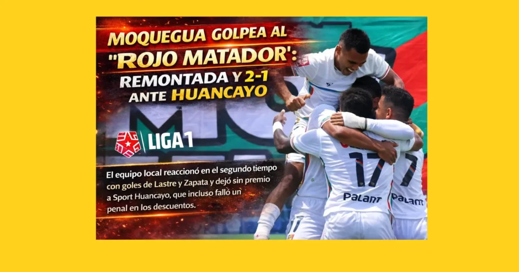 El club peruano CD Moquegua derrotó 2-1 a Sport Huancayo este 7 de marzo por la sexta jornada del Torneo Apertura 2026 de la Liga 1. El equipo visitante se adelantó en el marcador con un gol de Yorleys Mena a los 21 minutos, pero el conjunto local reaccionó en el segundo tiempo con tantos de Edgar Lastre (49’) y Yorman Zapata (61’), resultado que le permitió revertir el partido y sumar tres puntos en casa.