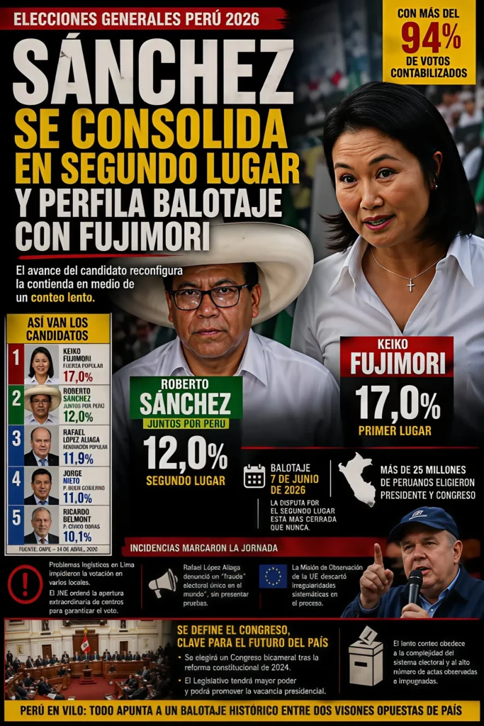 El candidato Roberto Sánchez escaló al segundo lugar en el recuento electoral de Perú tras las elecciones generales de abril de 2026, posicionándose como posible rival de Keiko Fujimori en la segunda vuelta, en un proceso marcado por la fragmentación del voto y el lento avance del escrutinio.