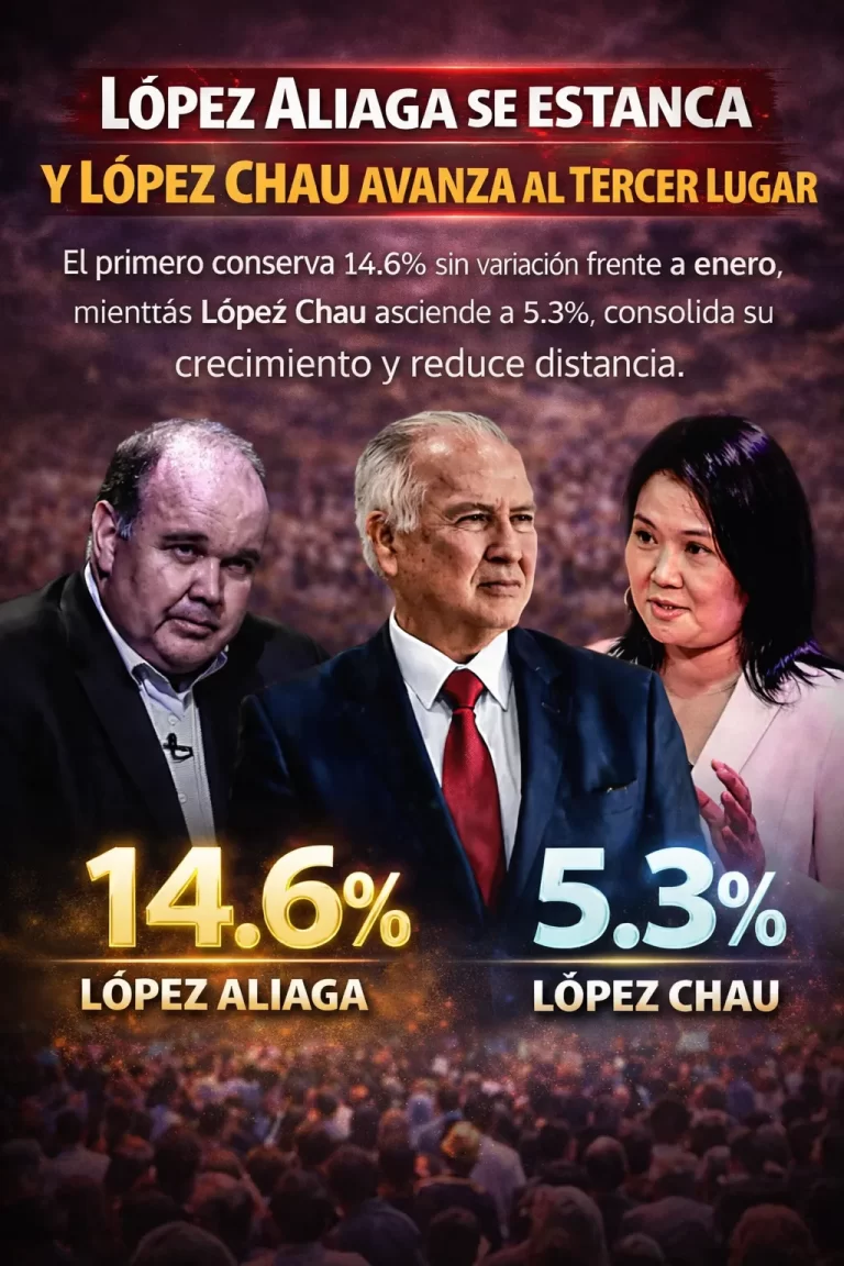 El primero conserva 14.6% sin variación frente a enero, mientras López Chau asciende a 5.3%, consolida su crecimiento y reduce distancia en la recta final hacia las elecciones 2026, según el IEP. A menos de dos meses de las Elecciones…