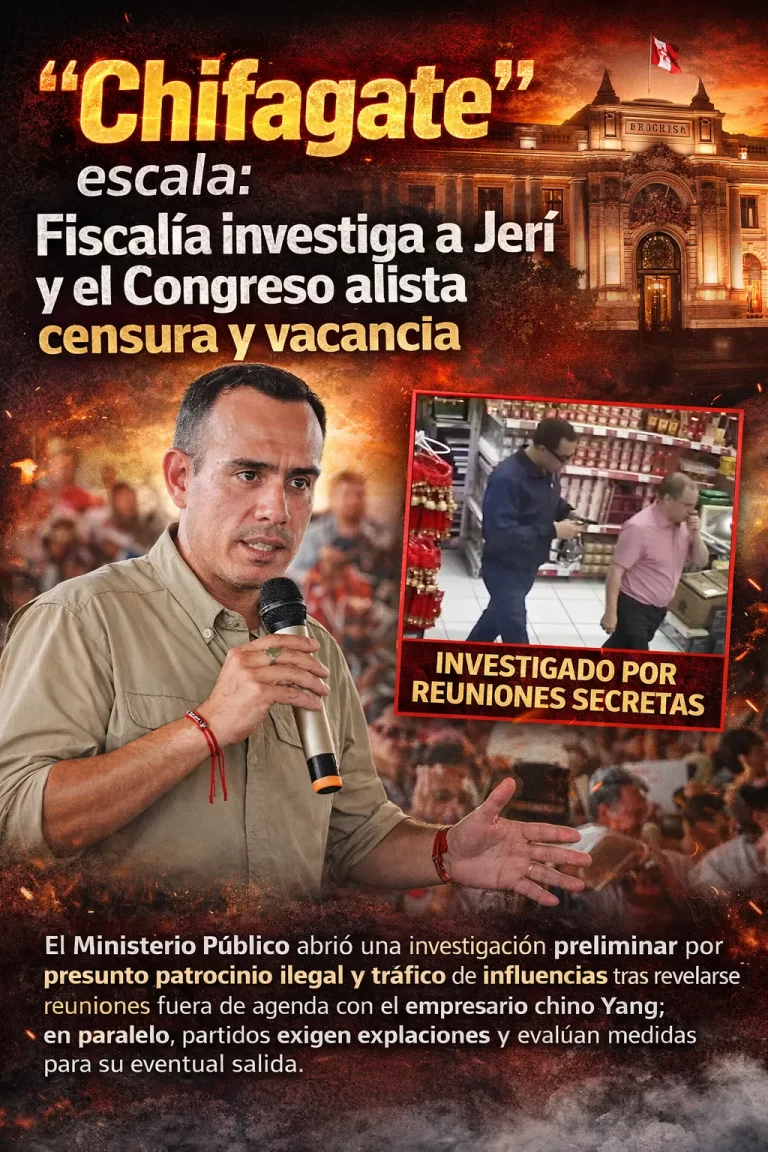 El Ministerio Público abrió una investigación preliminar por presunto patrocinio ilegal y tráfico de influencias tras revelarse reuniones fuera de agenda con el empresario chino Yang; en paralelo, partidos exigen explicaciones y evalúan medidas para su eventual salida. La Fiscalía…