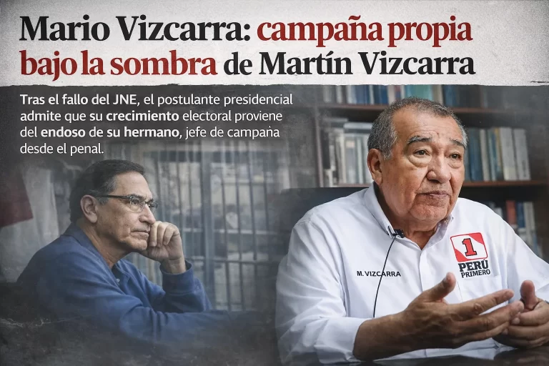 Tras el fallo del JNE, el postulante presidencial admite que su crecimiento electoral proviene del endose de su hermano, jefe de campaña desde el penal. Mario Vizcarra, candidato presidencial de Perú Primero, reanudó su campaña luego de que el Jurado…