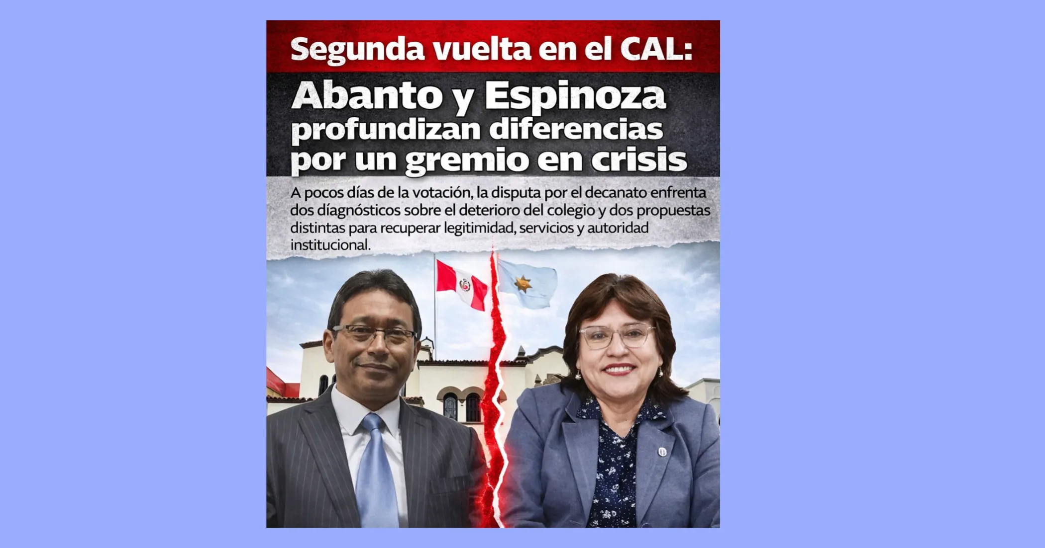 El Colegio de Abogados de Lima elegirá a su próximo decano en segunda vuelta el 14 de marzo de 2026, en una contienda entre Humberto Abanto y Delia Espinoza, quienes llegaron a esta etapa tras no superar el 50% en la primera votación. Según los resultados difundidos, Espinoza obtuvo 18.899 votos, equivalentes al 39,1%, mientras que Abanto alcanzó 12.604 votos, el 26,1%. En entrevistas difundidas por La República, ambos candidatos expusieron propuestas para reformar la Caja de Previsión, revisar el sistema ético del gremio y redefinir la posición del CAL frente a la crisis institucional del país.
