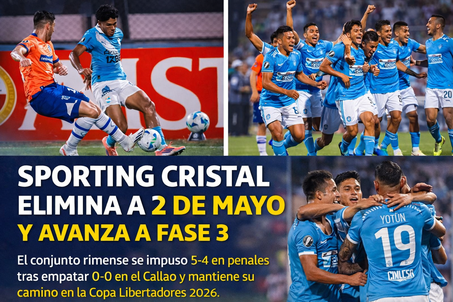 Sporting Cristal clasificó a la Fase 3 de la Copa Libertadores 2026 tras vencer 5-4 en la tanda de penales a 2 de Mayo, luego de igualar 0-0 en el tiempo reglamentario por la vuelta de la Fase 2. El encuentro se disputó el 24 de febrero en el Estadio Miguel Grau del Callao y se definió desde los doce pasos tras una serie equilibrada.