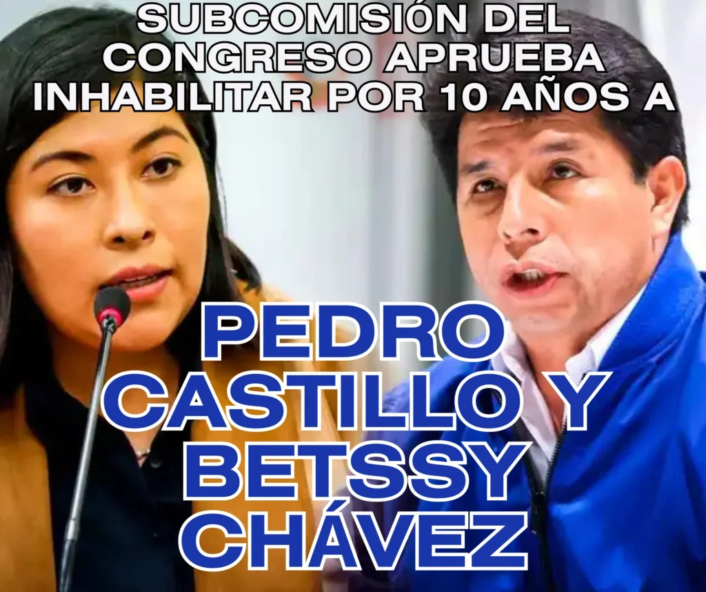 La Subcomisión de Acusaciones Constitucionales (SAC) del Congreso aprobó, con diez votos a favor y tres en contra, el informe final que recomienda la inhabilitación política por diez años del expresidente Pedro Castillo Terrones y de la ex primera ministra Betssy Chávez Chino, por su presunta participación en el intento de golpe de Estado del 7 de diciembre de 2022. El dictamen será remitido a la Comisión Permanente para su debate y eventual aprobación final.