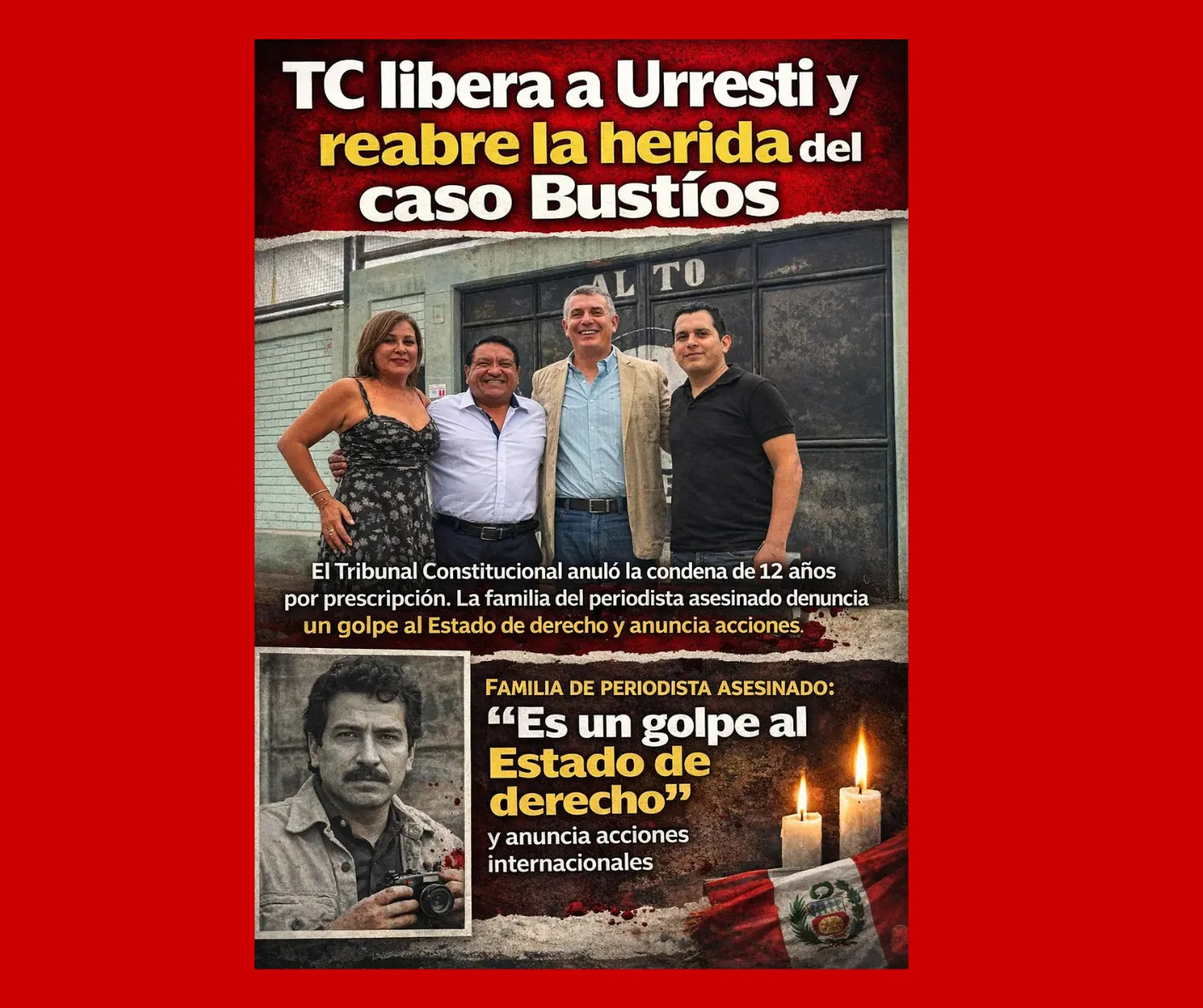 El exministro del Interior Daniel Urresti salió en libertad el 3 de marzo tras abandonar el penal Castro Castro, luego de que el Tribunal Constitucional del Perú anulara la condena de 12 años de prisión dictada en 2023 por el asesinato del periodista Hugo Bustíos. El fallo determinó que la acción penal había prescrito, decisión que fue cuestionada por la familia de la víctima y organizaciones de derechos humanos.