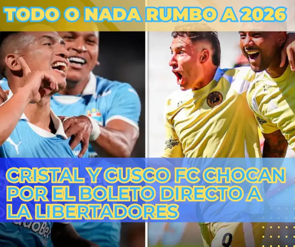 Sporting Cristal y Cusco FC se enfrentarán este miércoles 10 y domingo 14 de diciembre, en Lima y Cusco respectivamente, para definir al equipo que obtendrá el cupo Perú 2 a la fase de grupos de la Copa Libertadores 2026. El encuentro de ida se jugará en condición de local para el club rimense —aún con estadio por confirmar—, mientras que la vuelta se realizará en el Inca Garcilaso de la Vega. La transmisión estará a cargo de L1 MAX, disponible en televisión y plataformas digitales autorizadas.